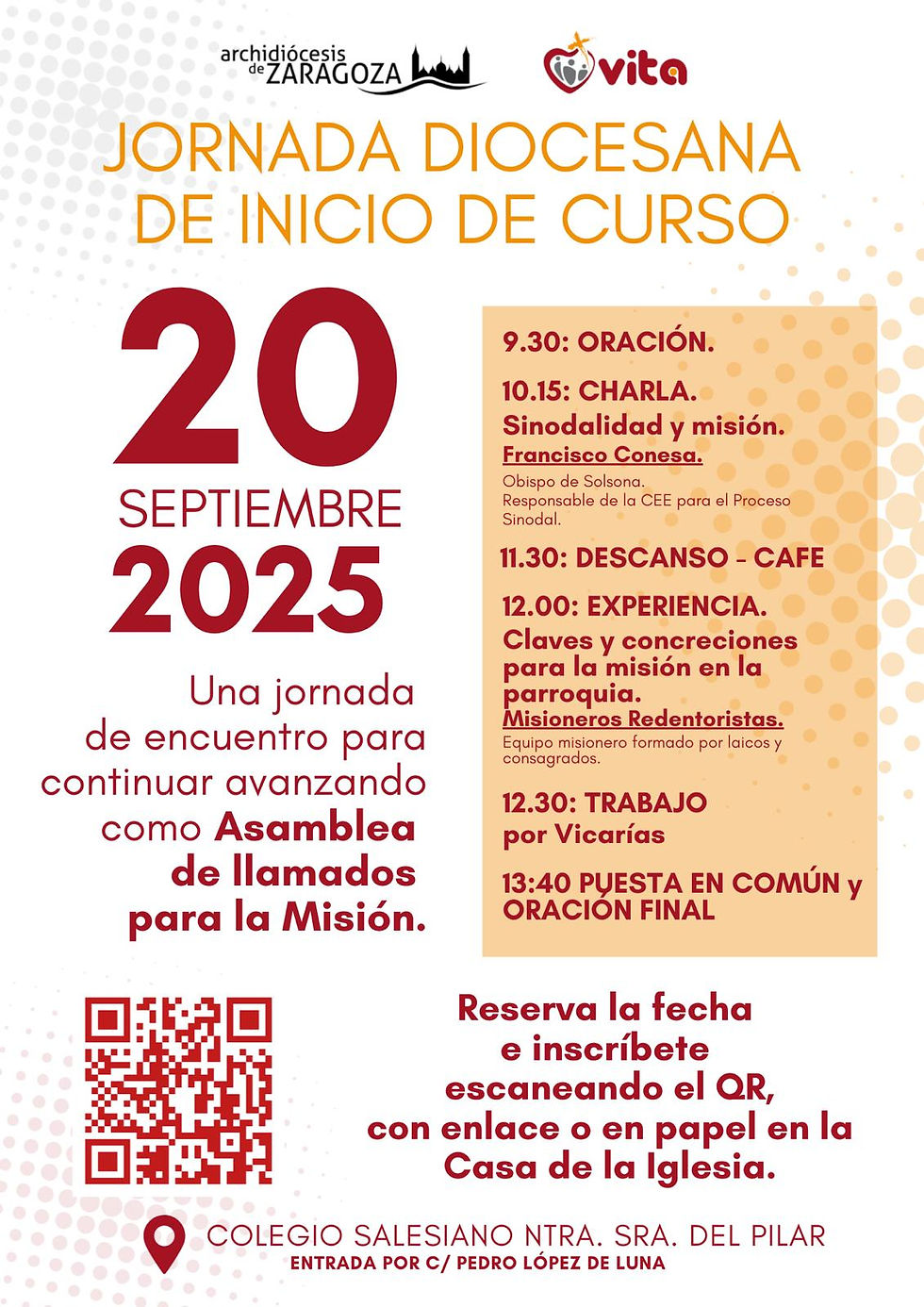 JORNADA DIOCESANA DE COMIENZO DE CURSOparroquiadelportillo12 sept 20251 Min. de lecturaEl 20 de septiembre, sábado tendrá lugar la Jornada Diocesana de Comienzo de Curso, en el Colegio Salesiano “Nuestra Señora del Pilar.”